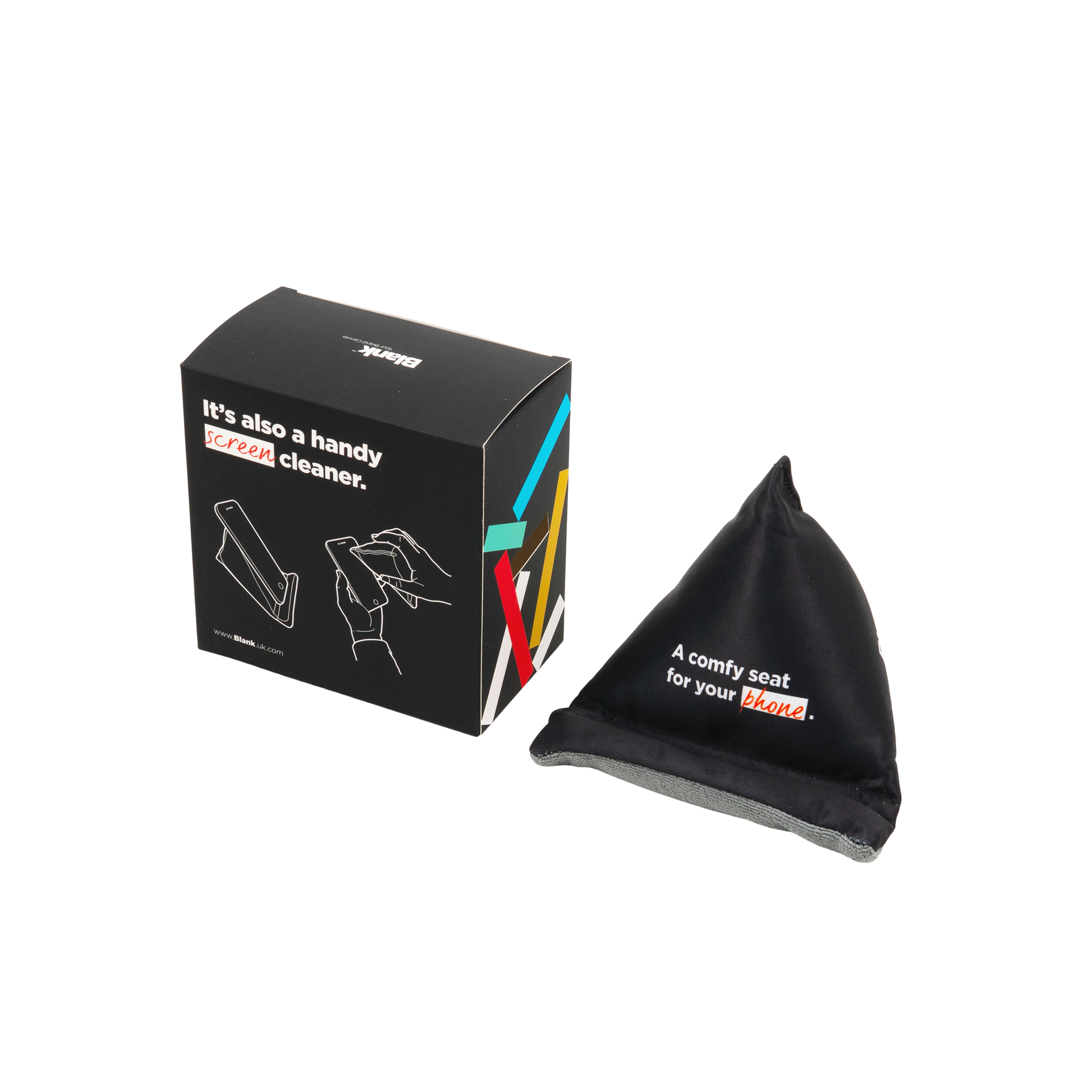 Soft touch triangular phone stand. Fully bespoke design. Microfibre plush panel for screen cleaning.